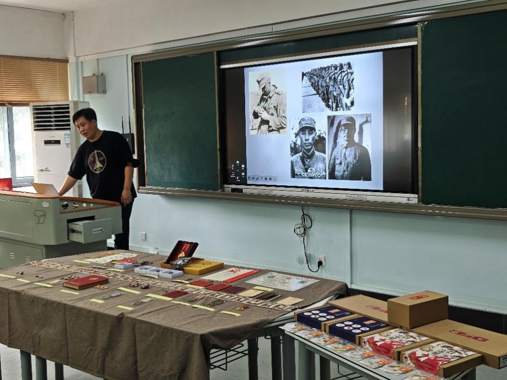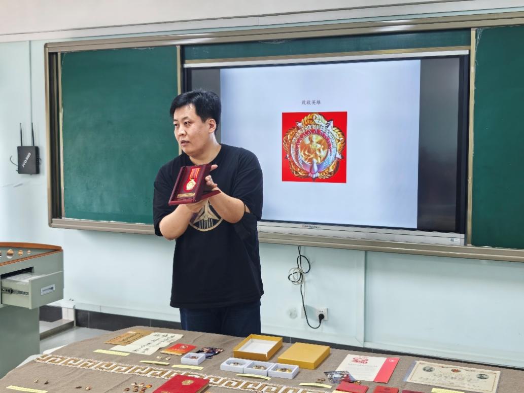 随后,美育教研室康峰老师带领大家走进一段充满理想与信念的革命岁月。他轻轻打开珍藏盒,郑重地捧出一枚历经岁月的一级国旗勋章,饱含敬意地讲述起彭德怀同志与它背后的故事。“这不仅仅是一枚勋章,”康老师的声音深沉而有力,“它见证了一位真正的革命者,如何把一生奉献给祖国和人民。它们承载的,是先烈们‘为有牺牲多壮志,敢教日月换新天’的豪情,是他们对我们后人沉甸甸的嘱托。”