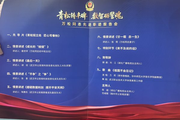 报告会上,通过专题视频短片、同事深情讲述、家属含泪回忆等多维形式,全方位展现了万松同志的先进形象——他是刑侦一线的“尖刀利刃”,以精益求精的态度啃下诸多案件“硬骨头”;他是群众身边的“暖心卫士”,以温暖真诚的姿态解决无数民生“小烦恼”;他更是“舍小家为大家”的奉献者,将“群众的事比天还大”的信念刻进了生命底色。一个个鲜活细节交织成的精神图谱,让现场不少听众潸然泪下,也为后续《祖国不会忘记》的艺术表达积蓄了情感力量。