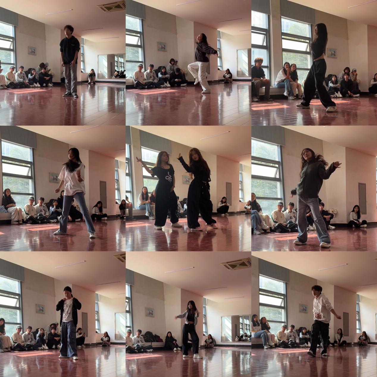 最令人期待的“新生杯”街舞交流赛展示环节,将现场氛围推向高潮。起初,新生们还略带羞涩,在学长学姐的鼓励与掌声中,陆续有新生主动走上前,展示自己提前准备的街舞片段——有的新生带来活力满满的爵士舞,卡点精准、动作利落;有的新生演绎酷炫的Hip-hop,自由随性、气场全开;还有2名新生精心组队编排,合作完成了一段创意编舞,《咆哮》《supernova》《sexy back》…瞬间点燃全场热情。每一位新生展示结束,现场都响起雷鸣般的掌声与欢呼声。