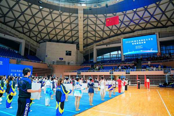 当日下午2:00,开幕式准时启幕。伴随着庄重的旋律,全体人员肃立奏唱国歌,赤诚之心与爱国情怀在赛场之上激荡回响。国歌毕,各高校参赛代表身着统一服装登场,共同带来集体花球表演,动感旋律中,花球翻飞如绚烂彩蝶,整齐划一的动作尽显高校学子的蓬勃朝气,瞬间点燃现场氛围,为赛事拉开精彩序幕。
